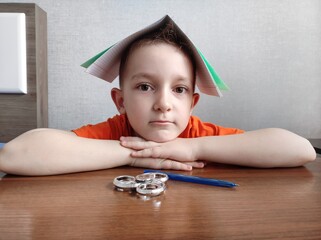 Tired boy with ADHD is bored in class, distracted, does not want to do homework. Therapy for ADHD children. Spinner and children with ADHD. Attention deficit and hyperactivity in children, neuropsycho