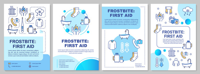 Frostbite first aid, low temperature effect brochure template. Flyer, booklet, leaflet print, cover design with linear icons. Vector layouts for magazines, annual reports, advertising posters