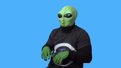 Professional artist in alien costume and in a black t-shirt laughs and clutches his head in hysteria against blue chromakey background. Role rehearsal.