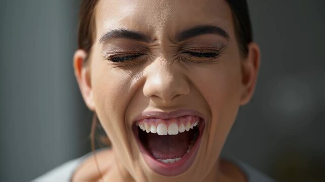 Close-up of a woman's face contorted in an intense reaction, mouth wide open, eyes tightly shut, conveying overwhelming emotion like a scream, shock or hysterical laughter for mental state concepts