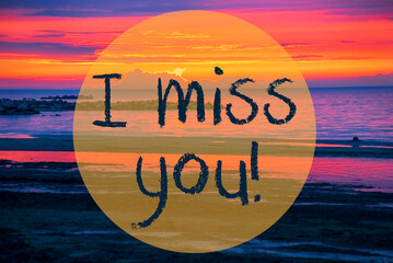 English Text I Miss You. Romantic Sunset Or Sunrise At Sea Or Ocean In Sweden, Scandinavia In The Background