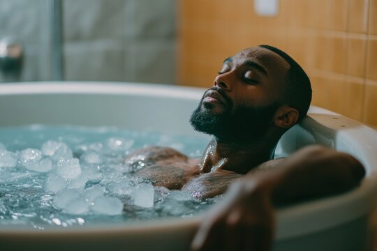 Man sits with closed eyes in the bath with ice cubes for recovery