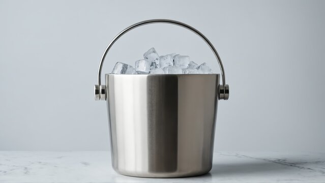 Stainless steel ice bucket filled with ice cubes on marble surface