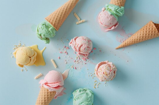Colorful ice cream cones with sprinkles on a pastel backdrop surrounded by festive confetti for party celebrations or summer events