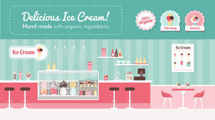Vintage ice cream parlor with pastel-colored decor. Vector flat minimalistic isolated illustration.
