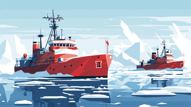 Convey the resilience and strength of icebreakers in a vector scene featuring these specialized vessels navigating through frozen Arctic waters breaking through ice sheets and facilitating