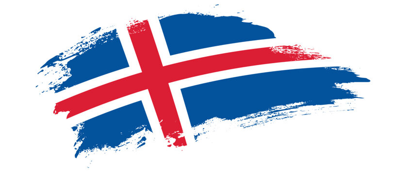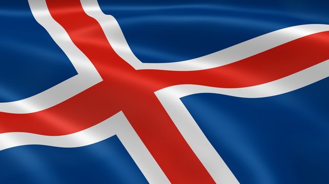 Iceland, Iceland national flag in the foreground, typical Icelandic houses with grass on the roof in the background
