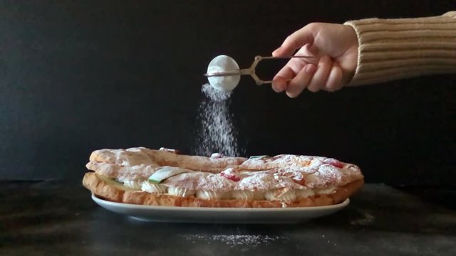 Overhead view of icing sugar on parchment paper sifted powdered sugar on a white table top view of powdered sugar