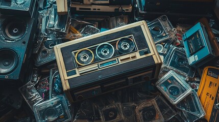 Retro boombox with cassette tapes scattered around