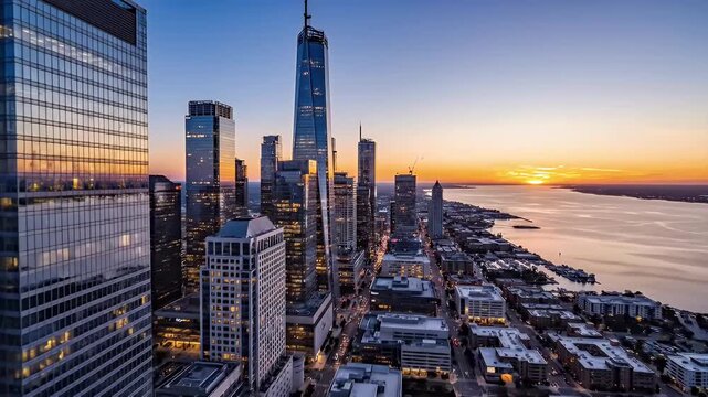 Stunning aerial view of New York City skyline at sunset showcasing iconic skyscrapers and the Hudson River bathed in warm golden light a symbol of urban ambition and progress