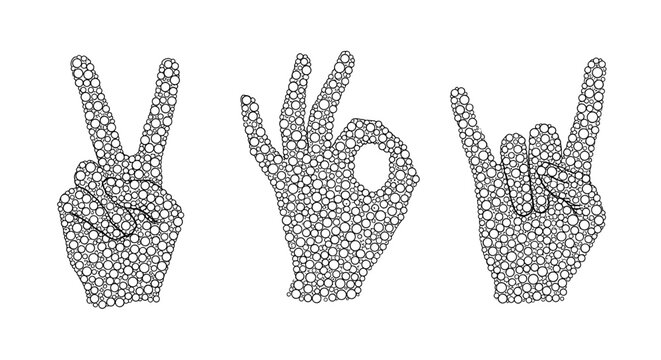 Geometric hand gestures art: peace, ok, and rock symbols in dotted style