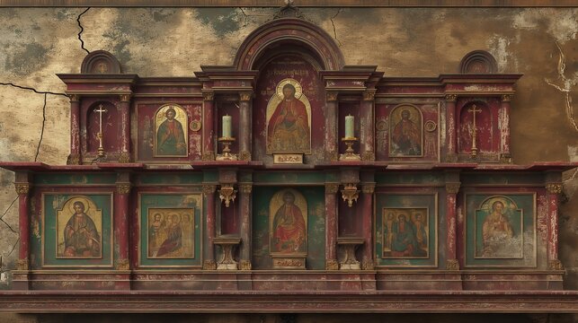 A weathered and detailed wooden iconostasis with religious images set into a cracked plaster wall