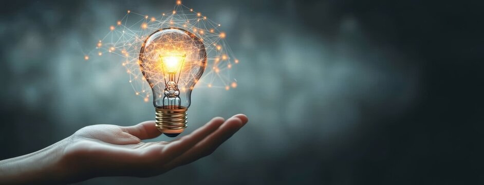 Businessman holding illuminated lightbulb, idea, innovation and inspiration with glowing light, smart intelligent creativity with bulb, Motivation and innovation concept. New idea business start up.