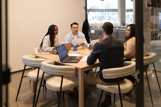 Businessman leading collaboration meeting with laptop for idea generation and employee training