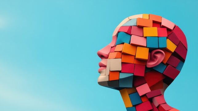 Abstract composition of facial elements with vibrant colors. Vibrant illustration of facial elements with dynamic geometric shapes in pop and cubist design.