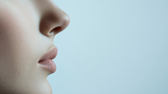 Profile of a woman breathing, showing perfect nose and lips after rhinoplasty surgery, ideal for beauty, cosmetology, and healthcare related themes