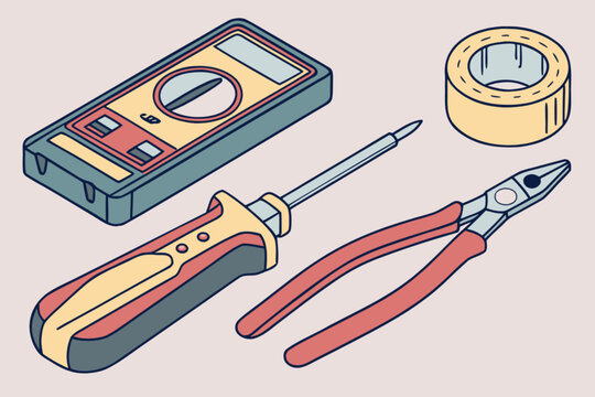 Electrical tools set for wiring and repair work, including multimeter, wire cutters, screwdriver, and tape, ideal for DIY home improvement and professional electrical services