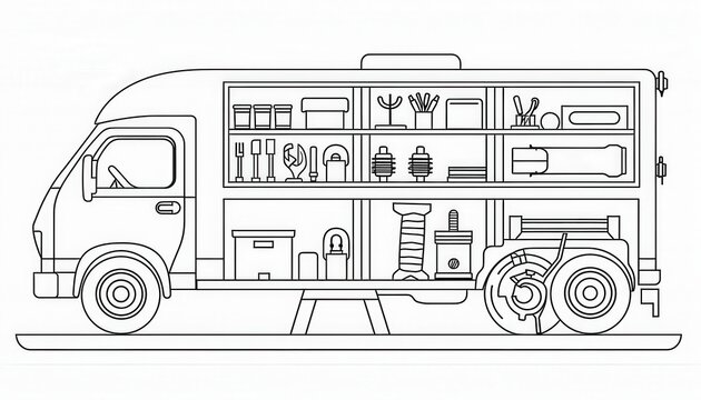 A detailed line art illustration of a customized utility van outfitted with various tools and equipment. Ideal for showcasing mobile workshops or service vehicles.
