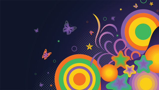 Vibrant abstract background featuring colorful circles stars butterflies and flowing shapes on dark backdrop ideal for kids designs events posters banners wallpapers and creative digital artwork
