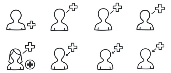 A collection of user icons with add symbols in minimalist black line vector style, ideal for social media and networking applications