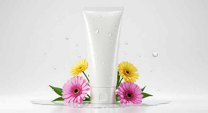 skin care product mockup, water splash, and fresh flowers, ideal for spa and wellness.