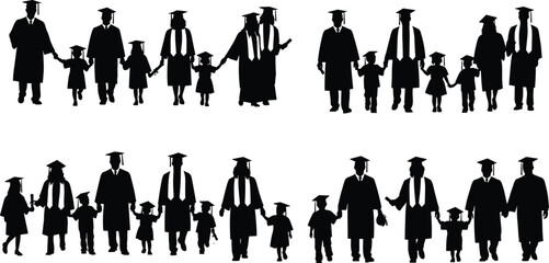 Silhouette vector illustration of graduating families with children and parents in caps and gowns, ideal for education designs, graduation themes, and celebration graphics