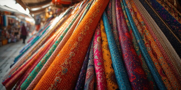 Close-up of colorful fabric swatches at a textiles market, ideal for background or layout design, Earth Day