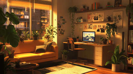 A small apartment living room repurposed as a home office, ideal for real estate rentals and home staging