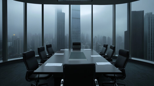 modern conference room with large table and black chairs, overlooking foggy city skyline. atmosphere is professional and somber, ideal for business meetings