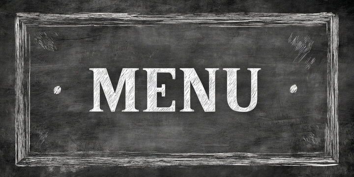 Chalkboard texture with a sketched frame, showing the word "MENU" in a hand-drawn style, offering free space for text or advertisement, ideal for restaurant or cafe menus