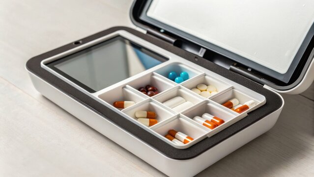 A modern pill organizer with compartments for various medications, featuring a clear lid and a sleek design, ideal for daily use.