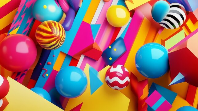 45.A vibrant, abstract composition of brightly colored geometric forms like spheres, cubes, and zigzag patterns, arranged in a dynamic and chaotic pattern, ideal for party promotions.