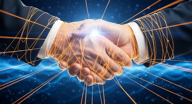 Business handshake with glowing network lines symbolizing partnership connection and technology ideal for corporate communications