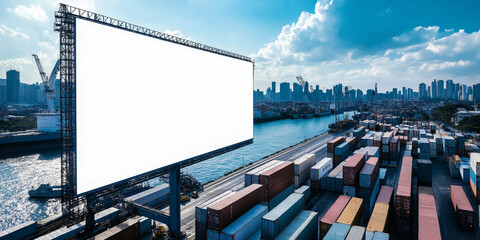 A blank billboard form on the side of a cargo ship, sailing through a busy port, ideal for inserting your advertising content