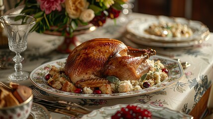 Invitation to elegant thanksgiving dinner with roast turkey and festive setting