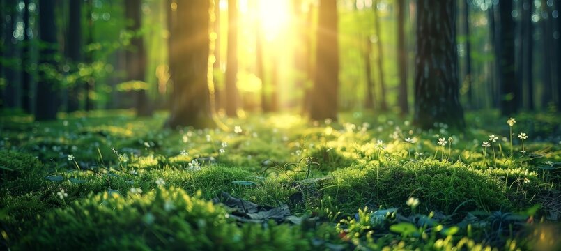 Tranquil spring forest landscape with moss covered rocks and small flowers, ideal for text overlay