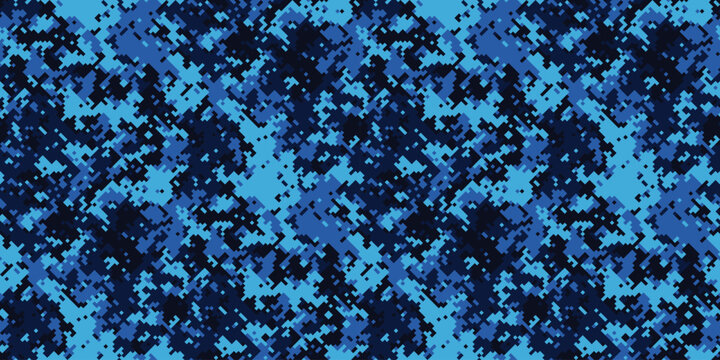 Abstract blue digital camouflage pattern.  Seamless texture ideal for backgrounds, textiles, or militarytactical designs.  Represents concealment, strategy, and modern aesthetics.