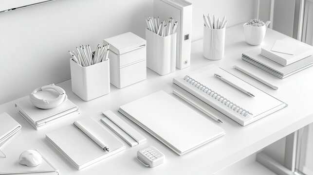 Clean and organized digital workspace featuring a minimalist computer, lamp, plants, and office supplies, ideal for efficient productivity and creative tasks