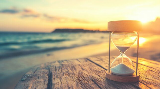 Sand timer on wooden table at beach during sunset with ocean waves