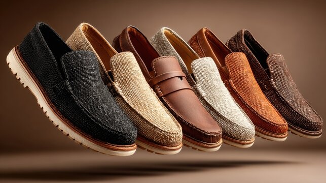 Creatively arranged footwear showcases a black slip-on, classic brown loafer, textured brown slip-on and brown leather shoe against a neutral backdrop
