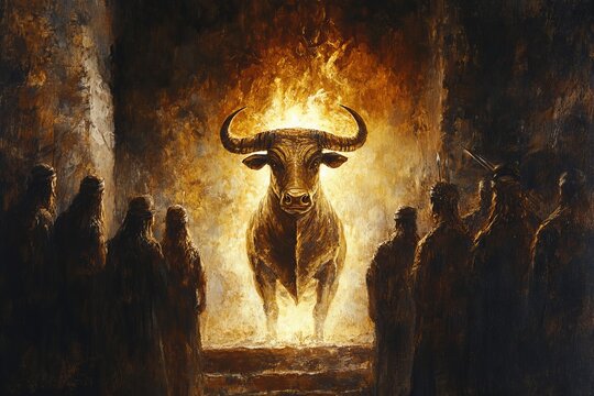 Golden calf statue illustration, symbolizing idolatry and worship, featuring a biblical concept from the Old Testament, perfect for religious and historic storytelling