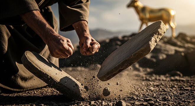 Moses Smashing Tablets: Moses Breaking the Ten Commandments Stone Tablets near Golden Calf