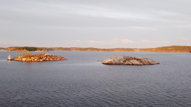 Der Schärengarten, die idyllische Inselgruppe vor Stockholm in Schweden mit Bebauung und toller Natur im Abendlicht, Ostsee