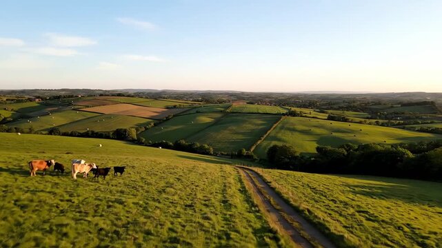 Pastoral Harmony: Scenic Farmland with Grazing Cattle at Sunset and Rolling Hills Vista creating a serene bucolic landscape