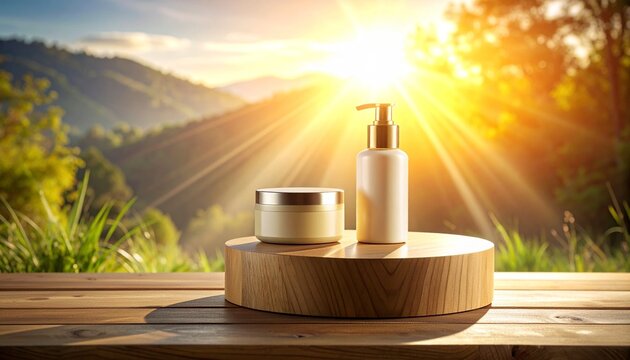 Natural skincare products on wooden pedestal in serene, sunny outdoor setting with lush greenery and warm sunlight, showcasing organic beauty products in a peaceful, idyllic scene.