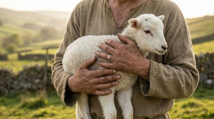 Pastoral serenity: shepherd holding lamb in idyllic countryside setting at sunset