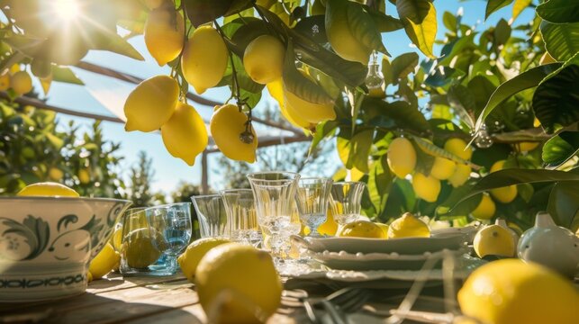 Sunlit Lemon Grove with Fresh Citrus and Tableware Setup