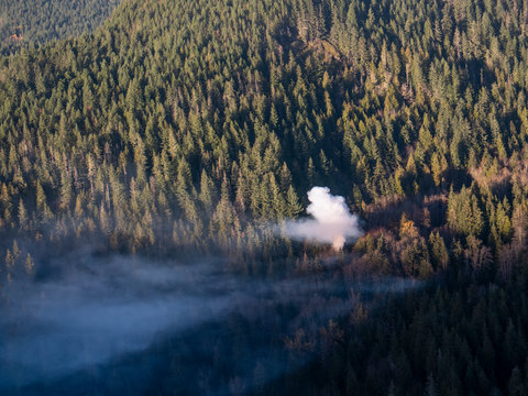 Flames of a campfire at night in a dark spooky forest surrounded by stones shaping strong shadows