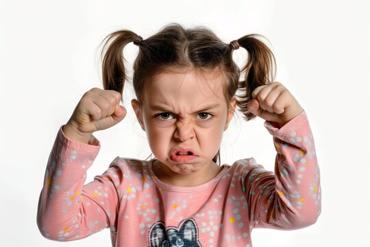 Angry little girl with pigtails clenching her fists. Concept of childhood anger, frustration, tantrum, defiance, and negative emotions.
