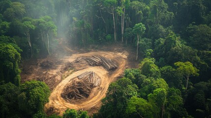 An aerial perspective of a deforested area with piles of freshly cut logs, highlighting the environmental consequences of illegal logging